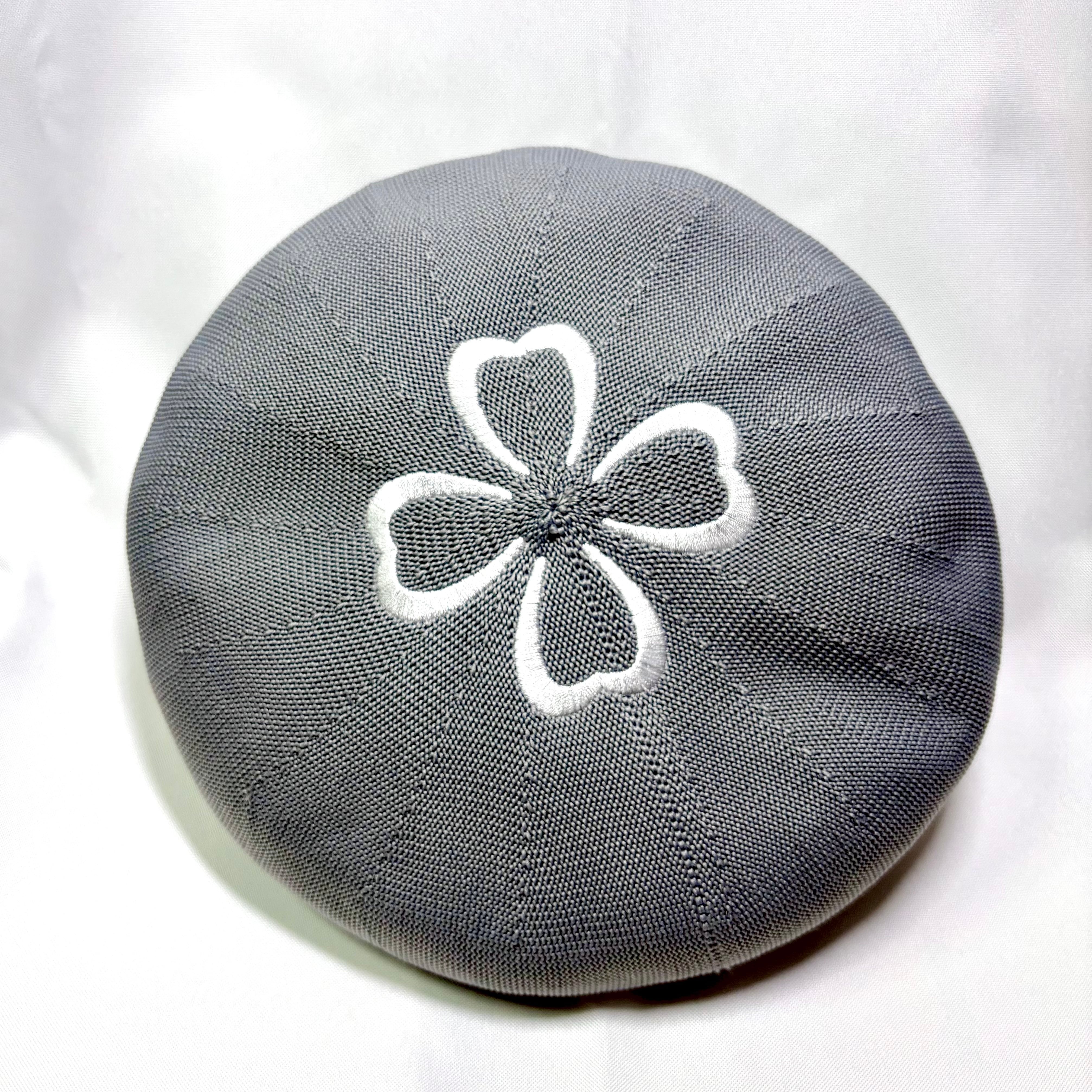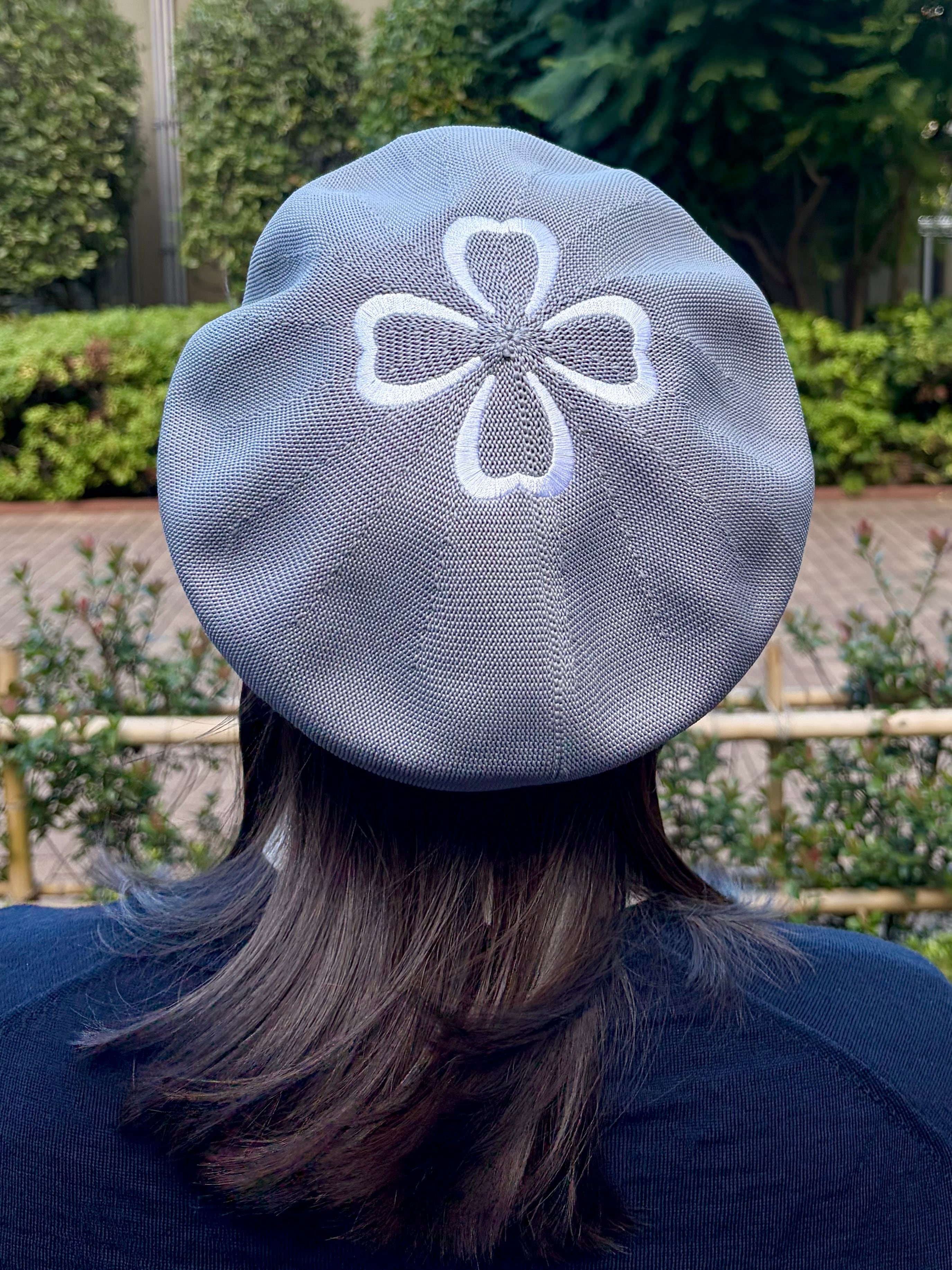 涼しげな素材のサマーベレー帽に、ツヤのある糸で模様を刺繍しております。