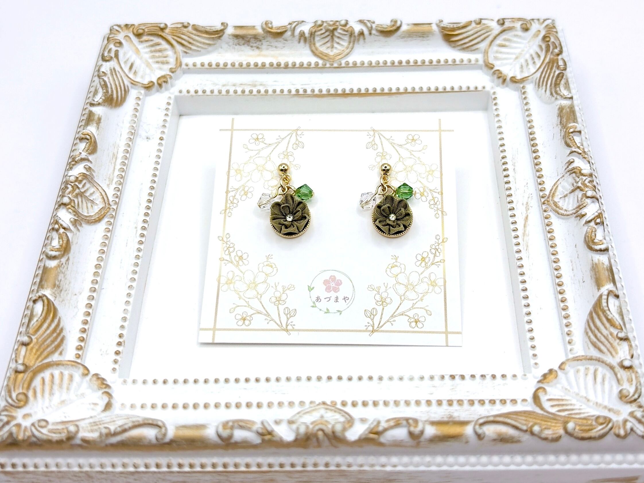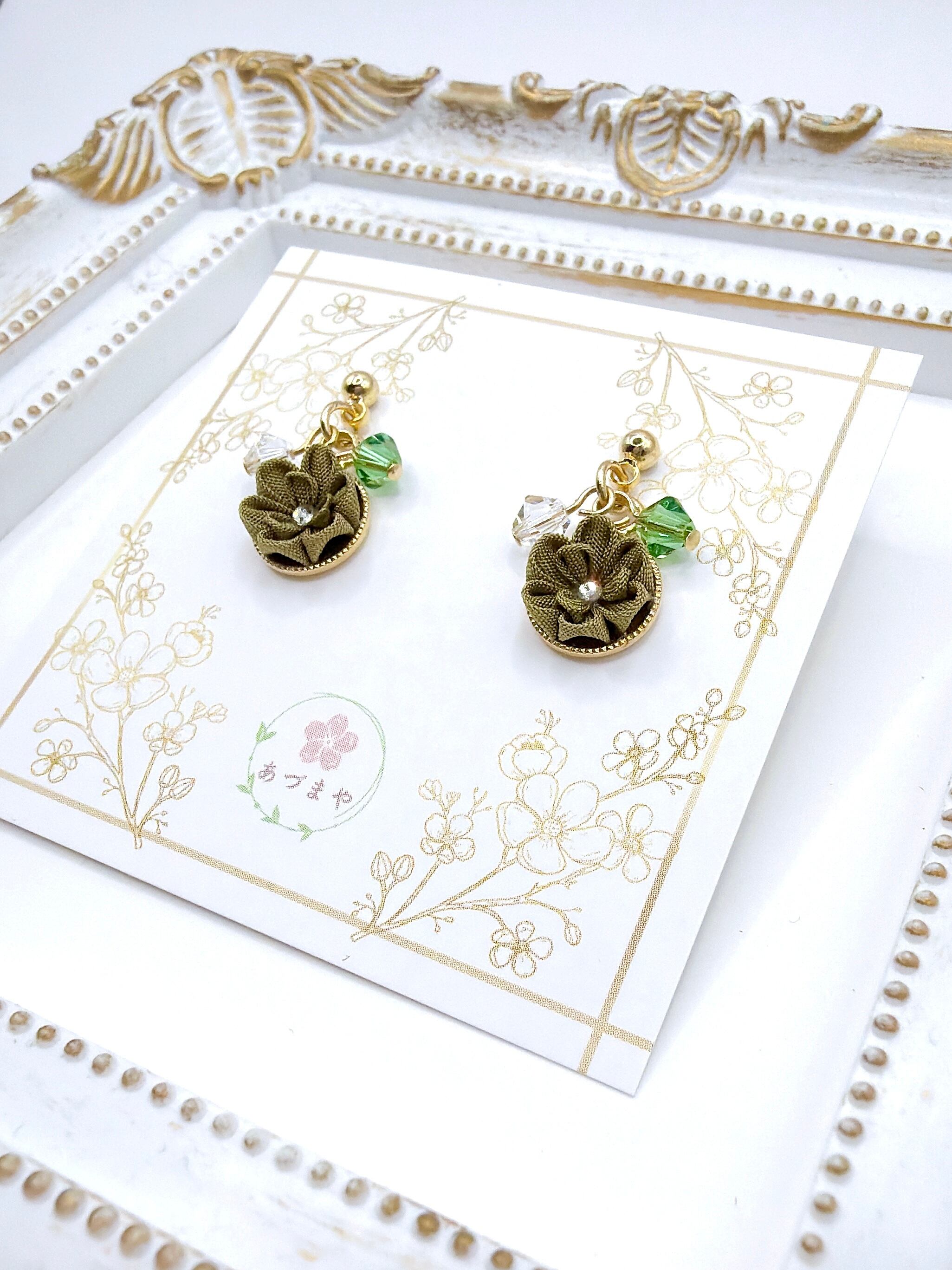 一粒サイズのつまみ細工と、つまみ細工のカラーに合わせたビーズを使用した、シンプルだけど華やかさのあるピアスです。