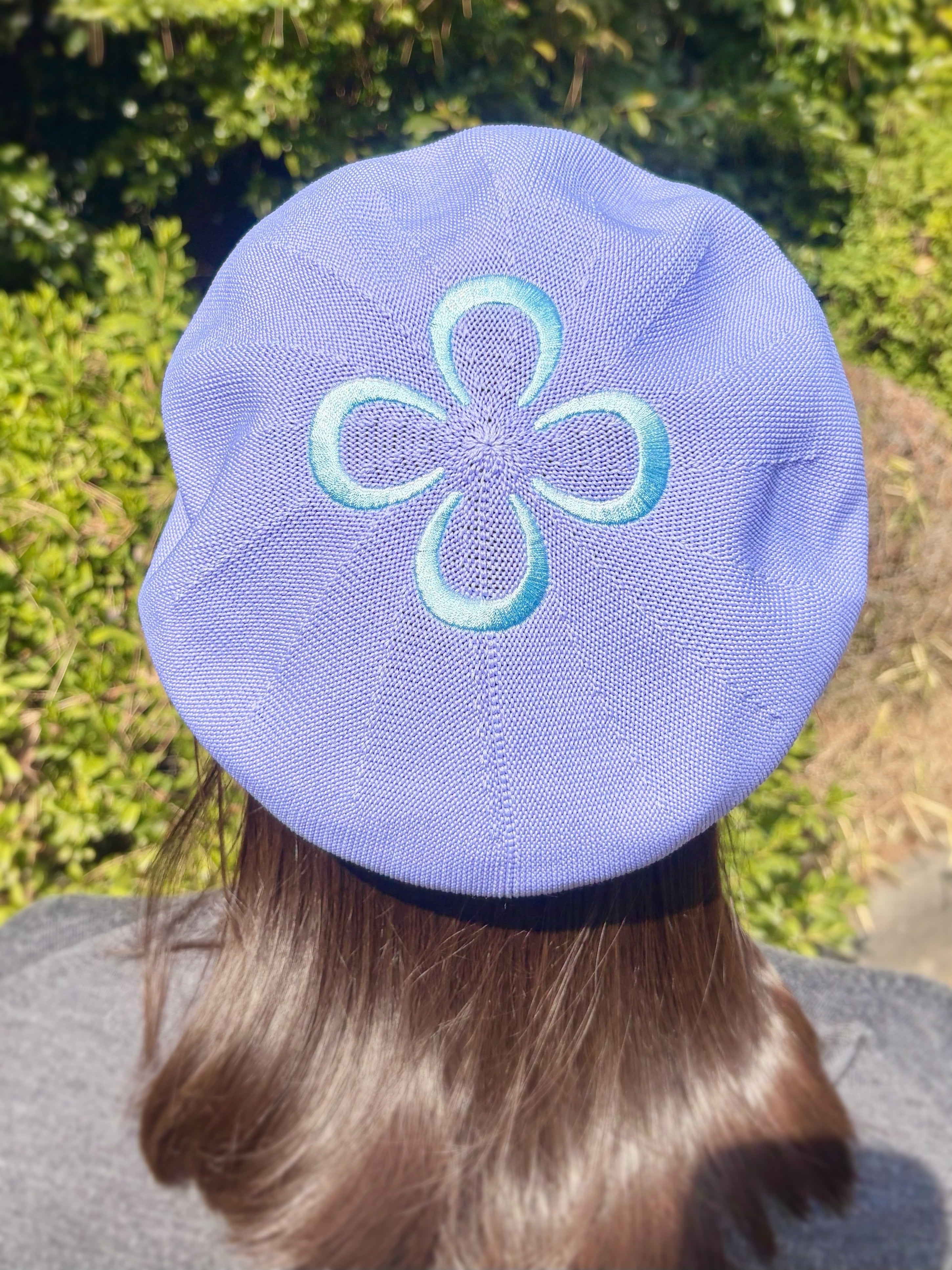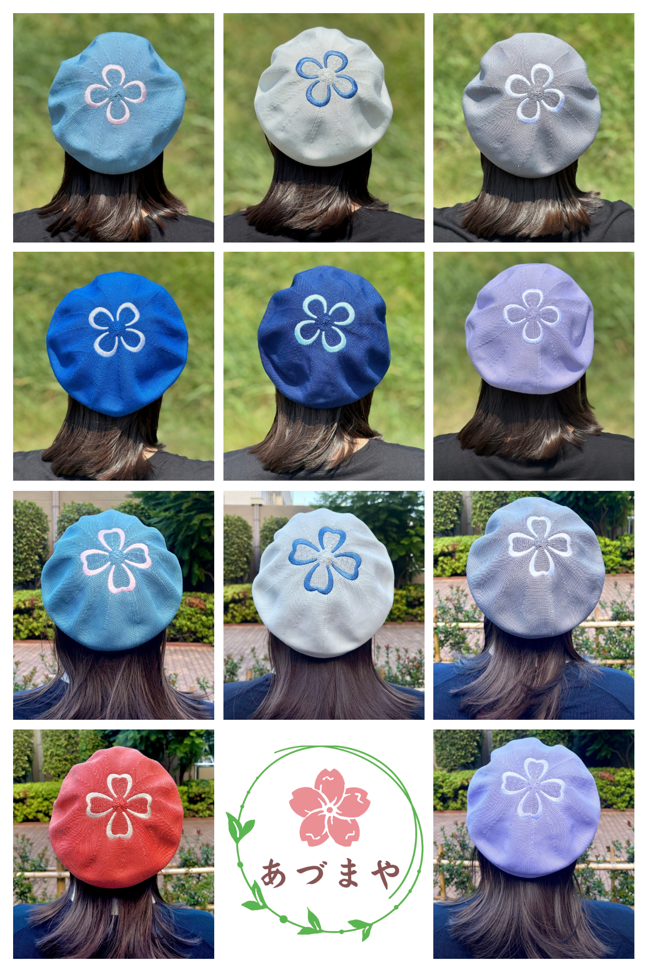 涼しげな素材のサマーベレー帽に、ツヤのある糸で模様を刺繍しております。