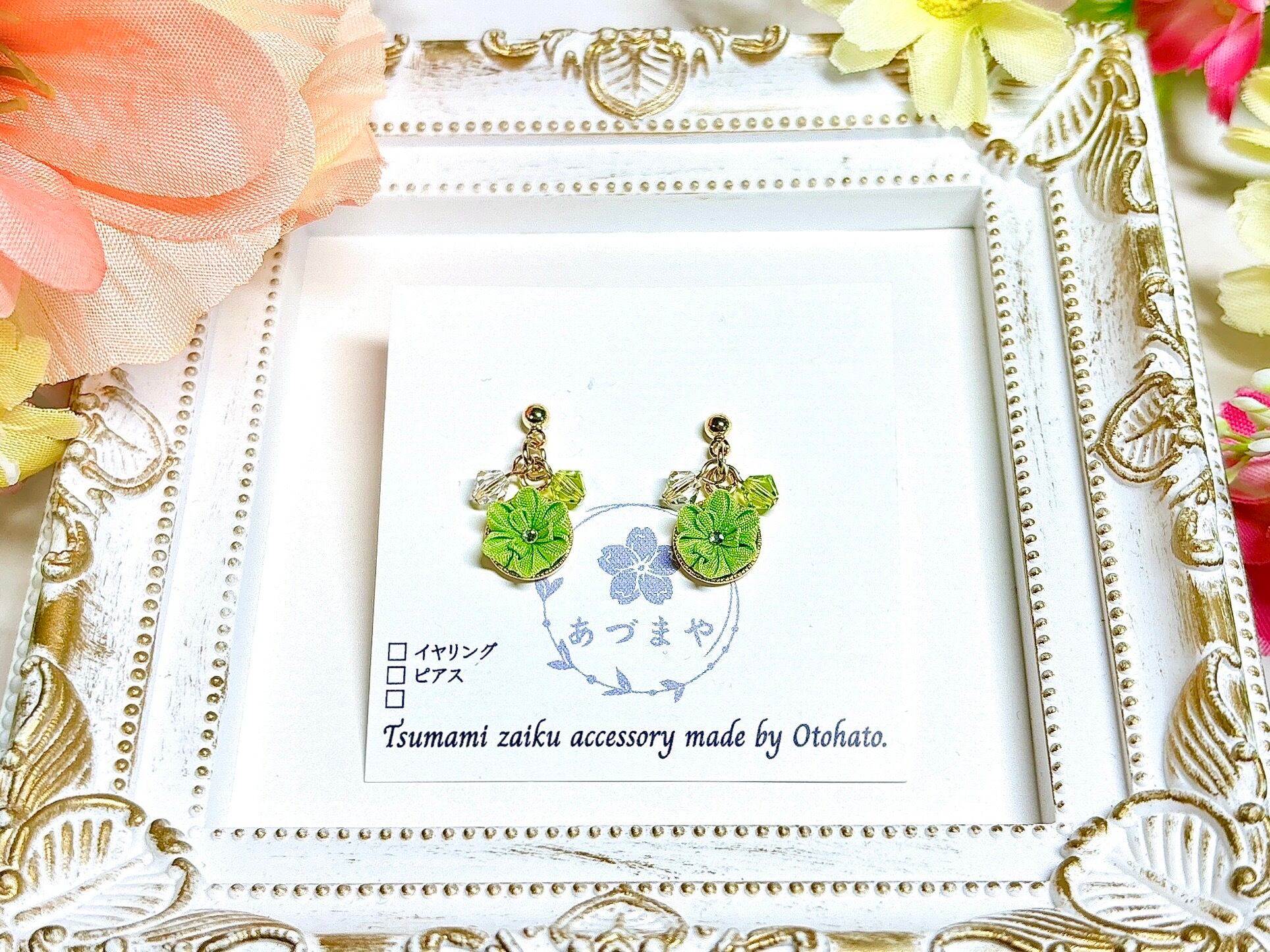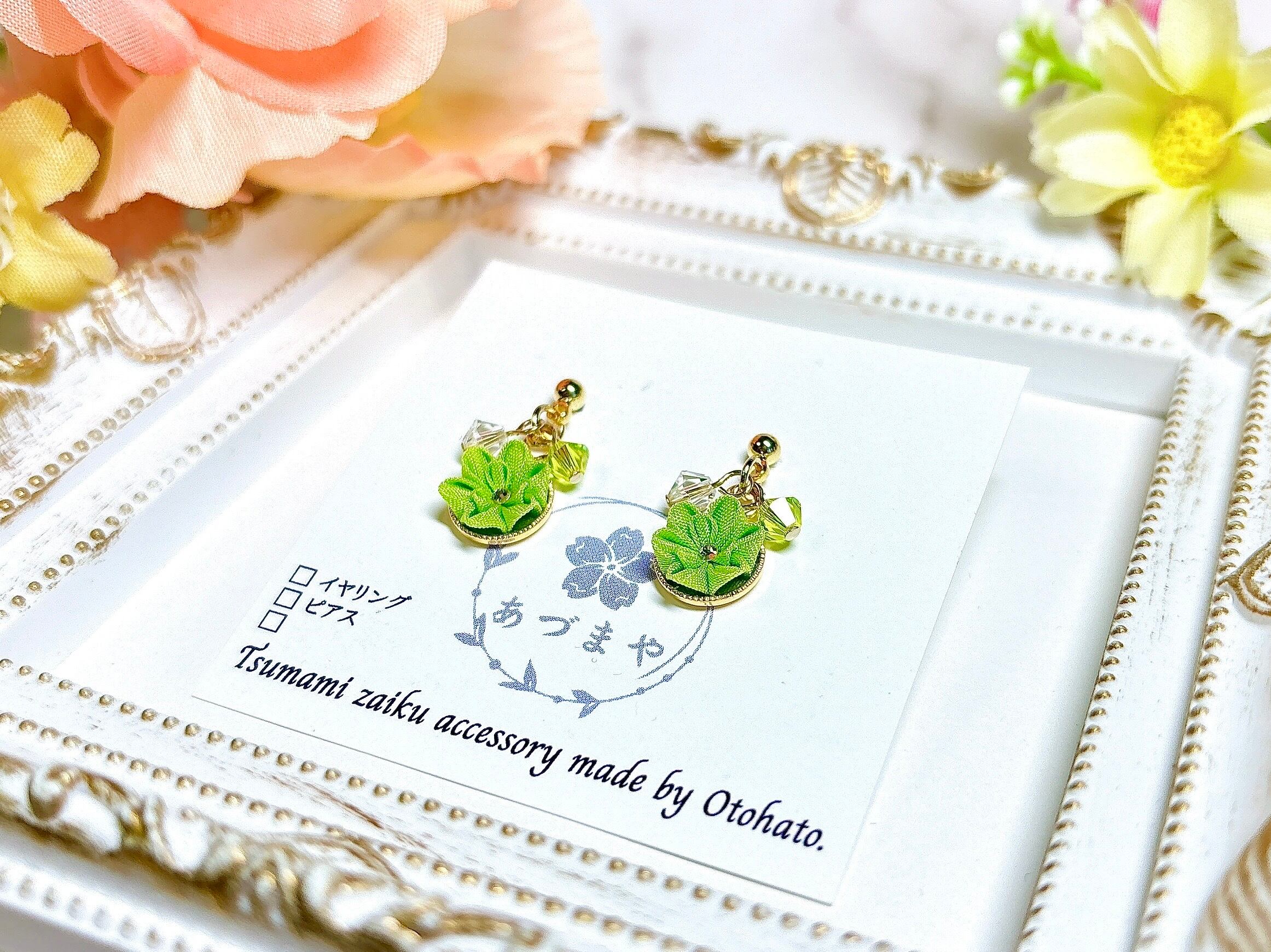 一粒サイズのつまみ細工と、つまみ細工のカラーに合わせたビーズを使用した、シンプルだけど華やかさのあるピアスです。