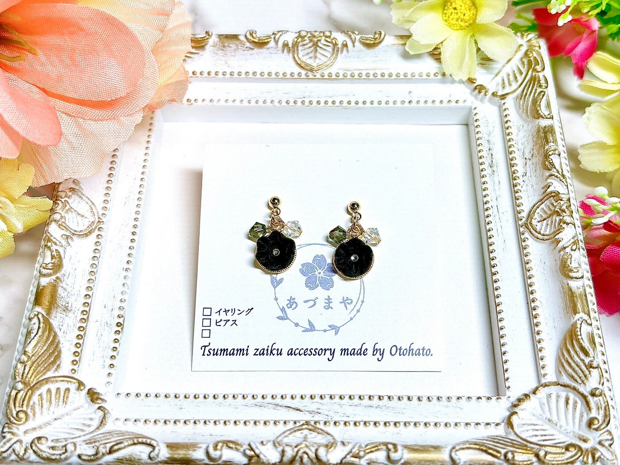 一粒サイズのつまみ細工と、つまみ細工のカラーに合わせたビーズを使用した、シンプルだけど華やかさのあるピアスです。