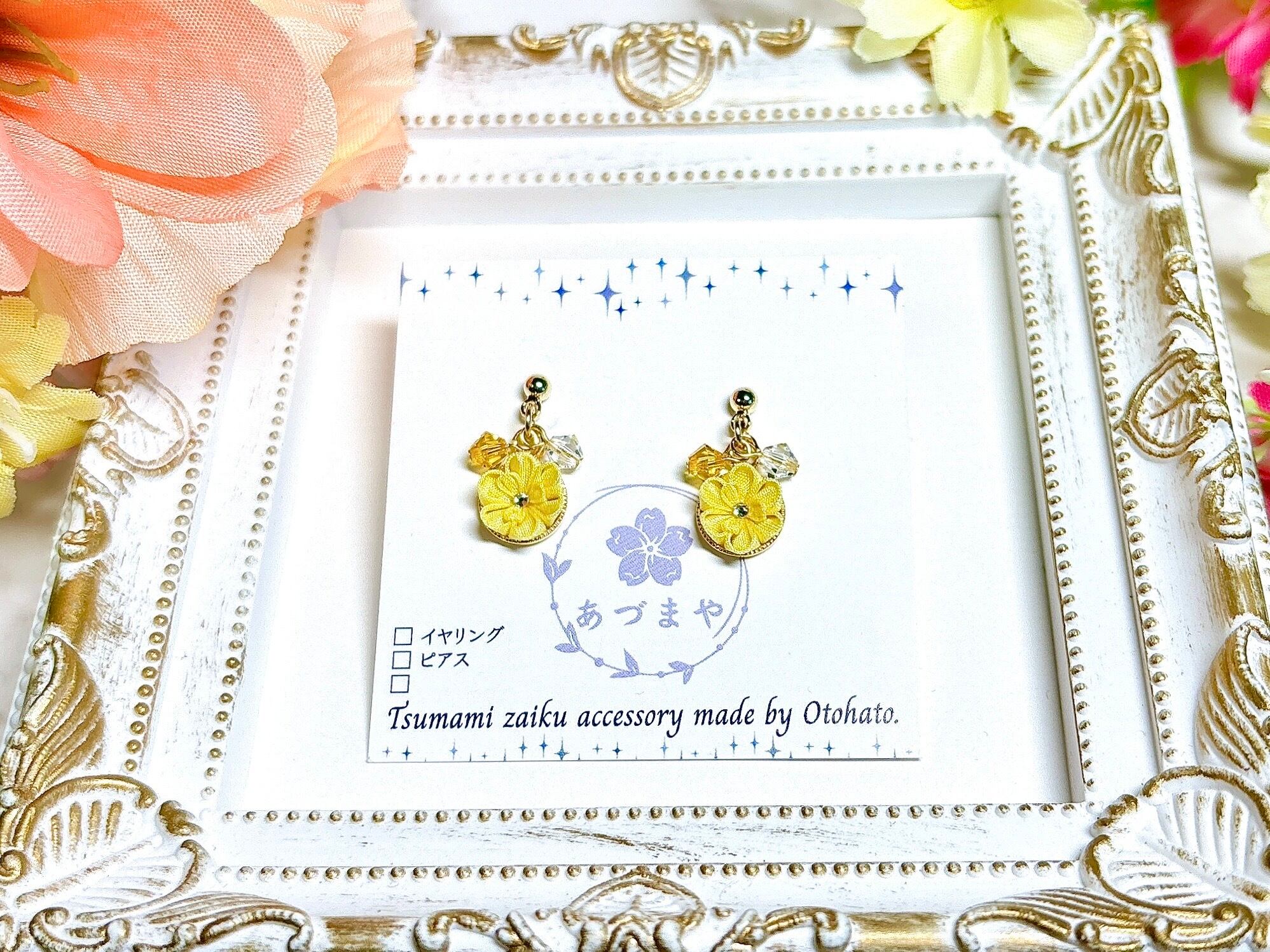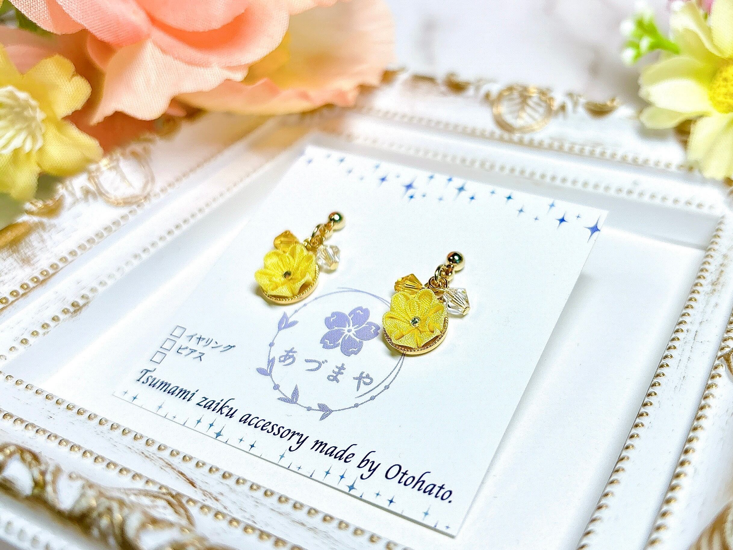 一粒サイズのつまみ細工と、つまみ細工のカラーに合わせたビーズを使用した、シンプルだけど華やかさのあるピアスです。