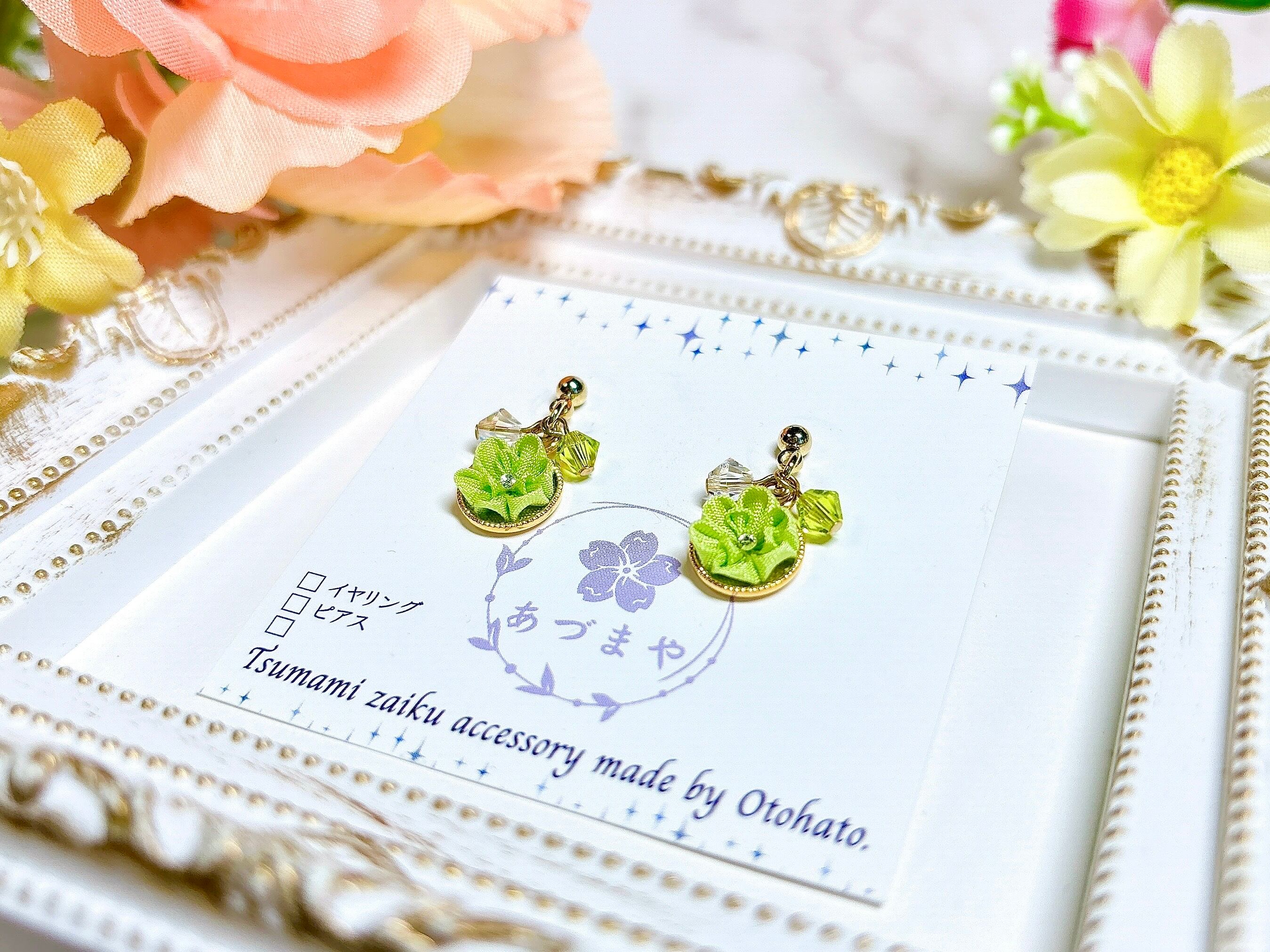 一粒サイズのつまみ細工と、つまみ細工のカラーに合わせたビーズを使用した、シンプルだけど華やかさのあるピアスです。