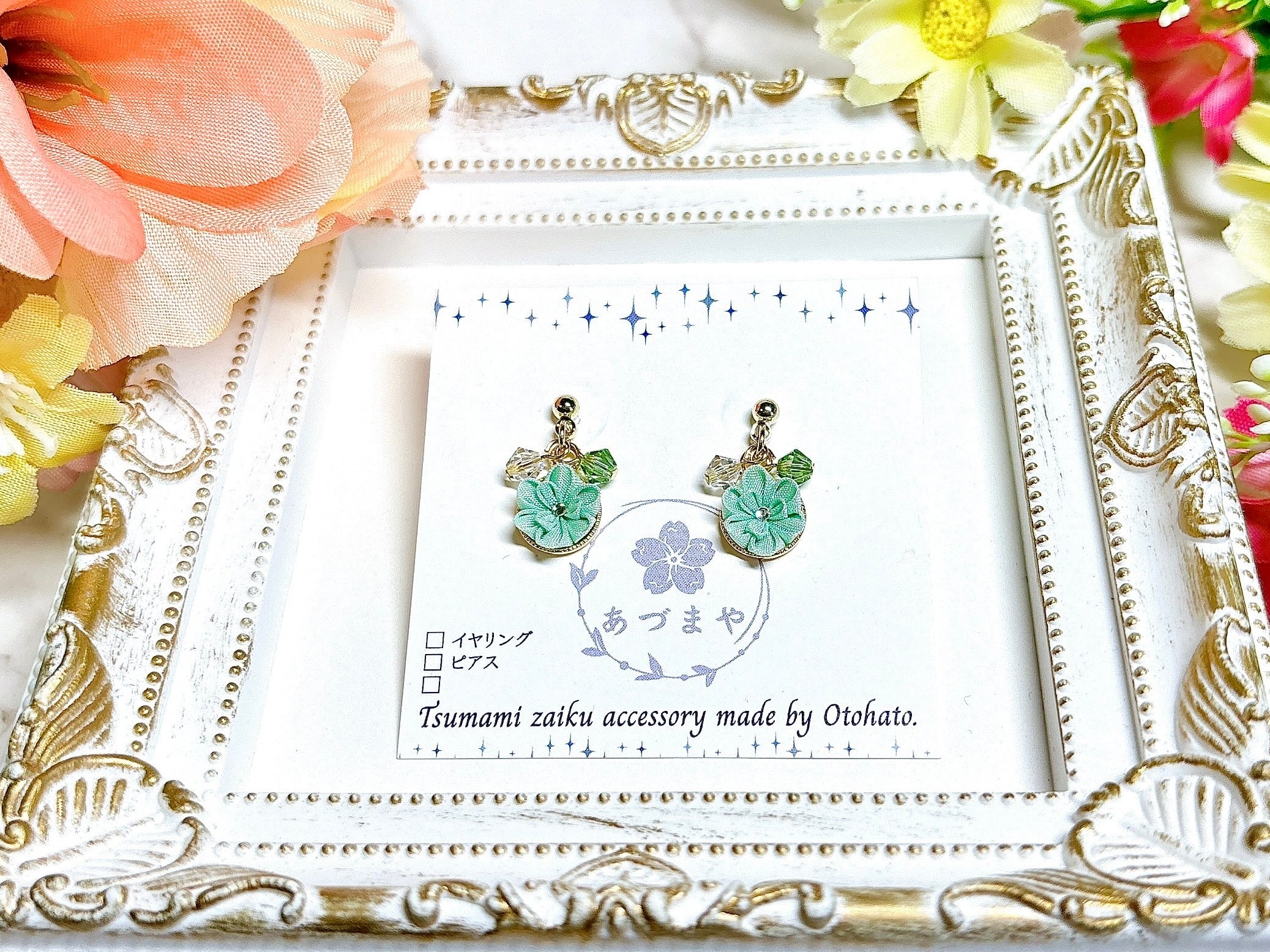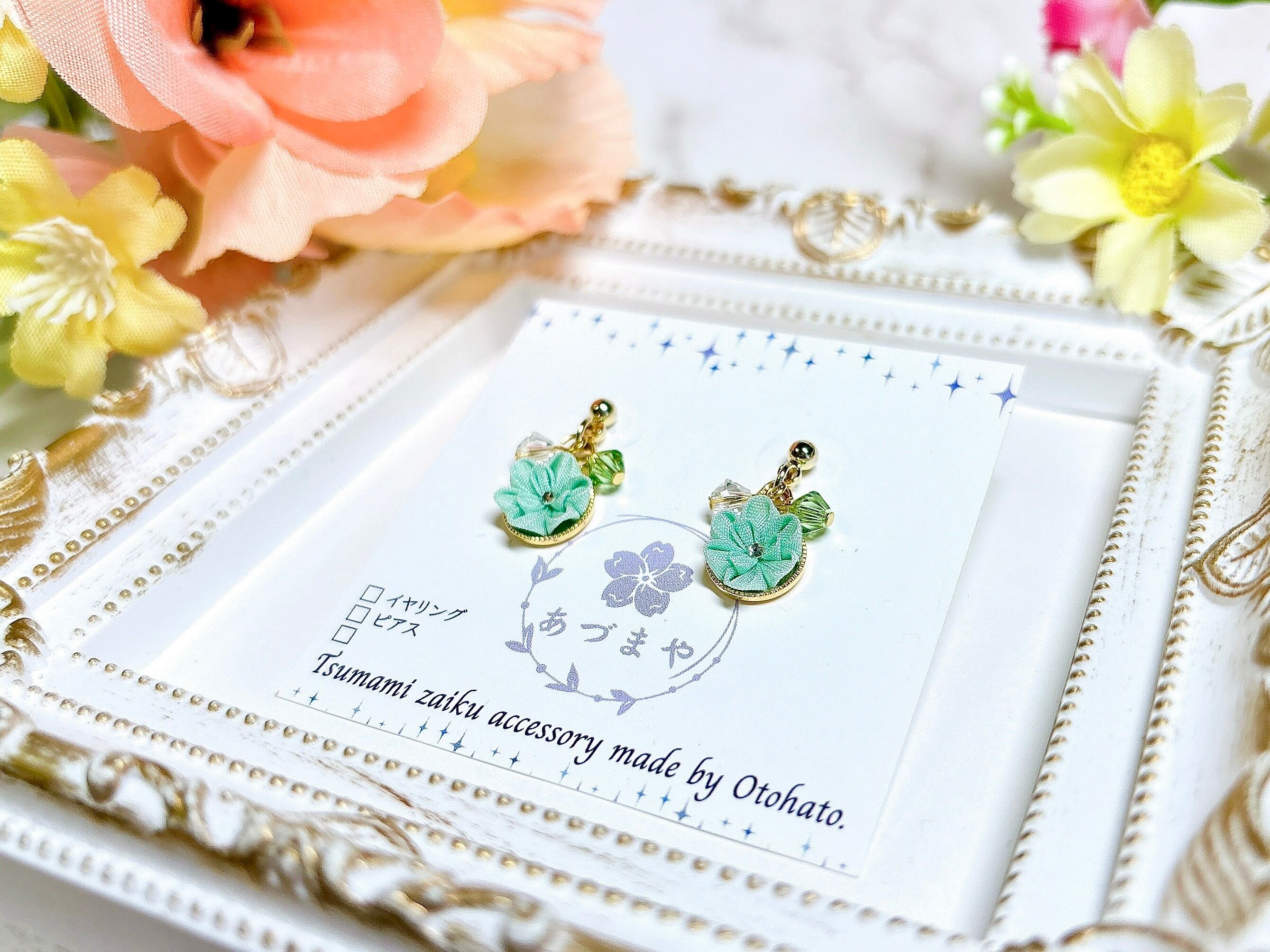 一粒サイズのつまみ細工と、つまみ細工のカラーに合わせたビーズを使用した、シンプルだけど華やかさのあるピアスです。