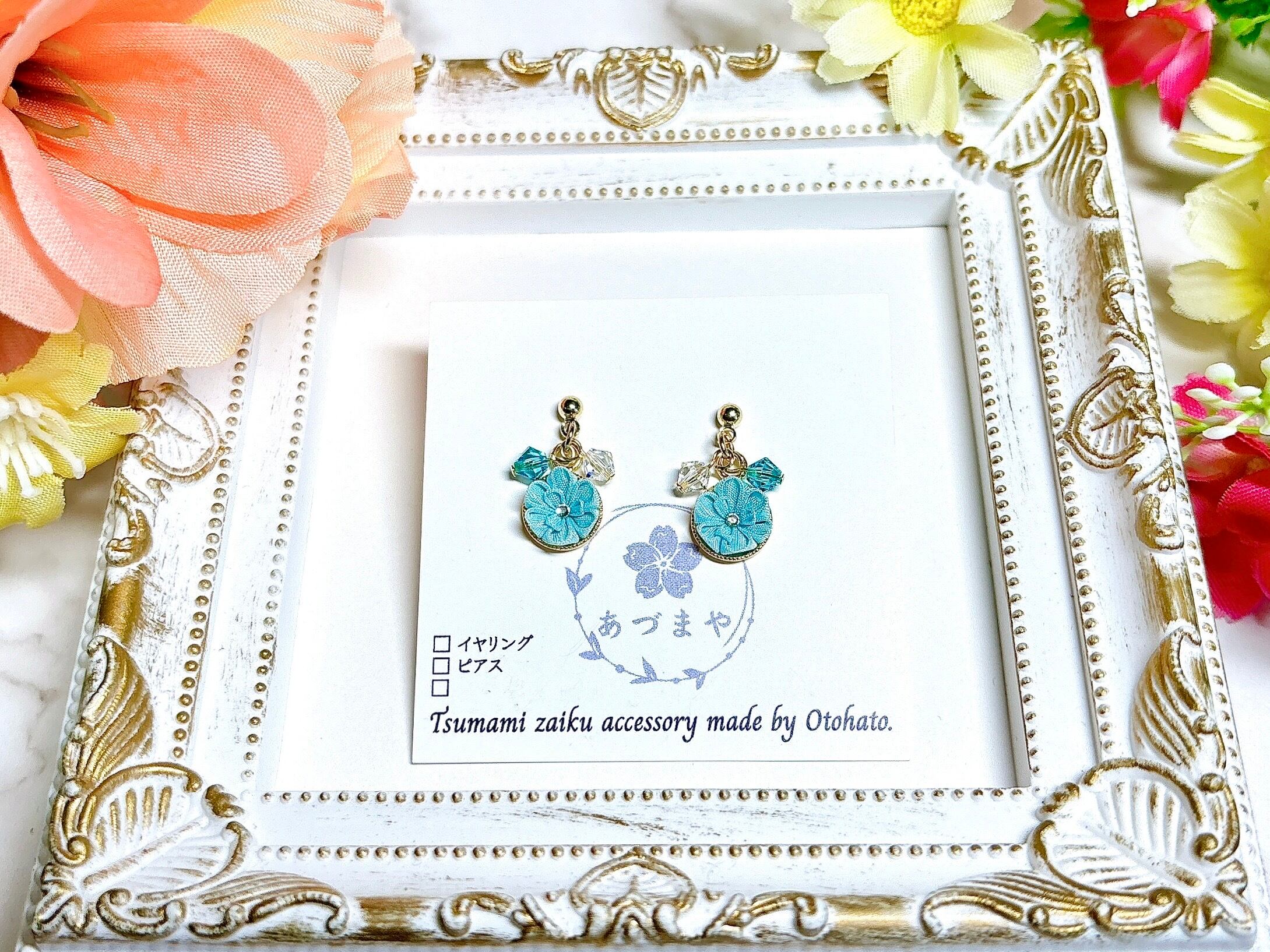 一粒サイズのつまみ細工と、つまみ細工のカラーに合わせたビーズを使用した、シンプルだけど華やかさのあるピアスです。